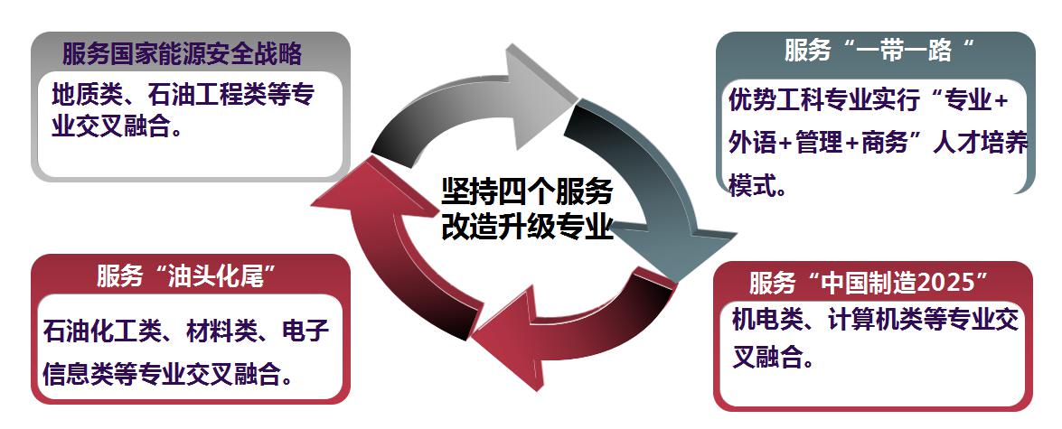 学校制定了《东北石油大学人才培养战略定位论证及专业结构优化调整论证工作方案》,成立书记和校长任组长的领导小组,将学校人才培养类型定位为以应用研究型人才为主,确定通过实施专业分类发展、加强一流专业建设、加快建设“新工科”、动态调整专业结构、推进专业集群发展等持续深化教育供给侧结构性改革,坚持“产业需求导向、跨界交叉融合、服务支撑引领”原则,厚植龙江沃土,深度回归油田,深化产教融合、科教融合、专创融合,全面优化支撑区域产业发展的学科专业体系,提升人才供给能力和供给质量。