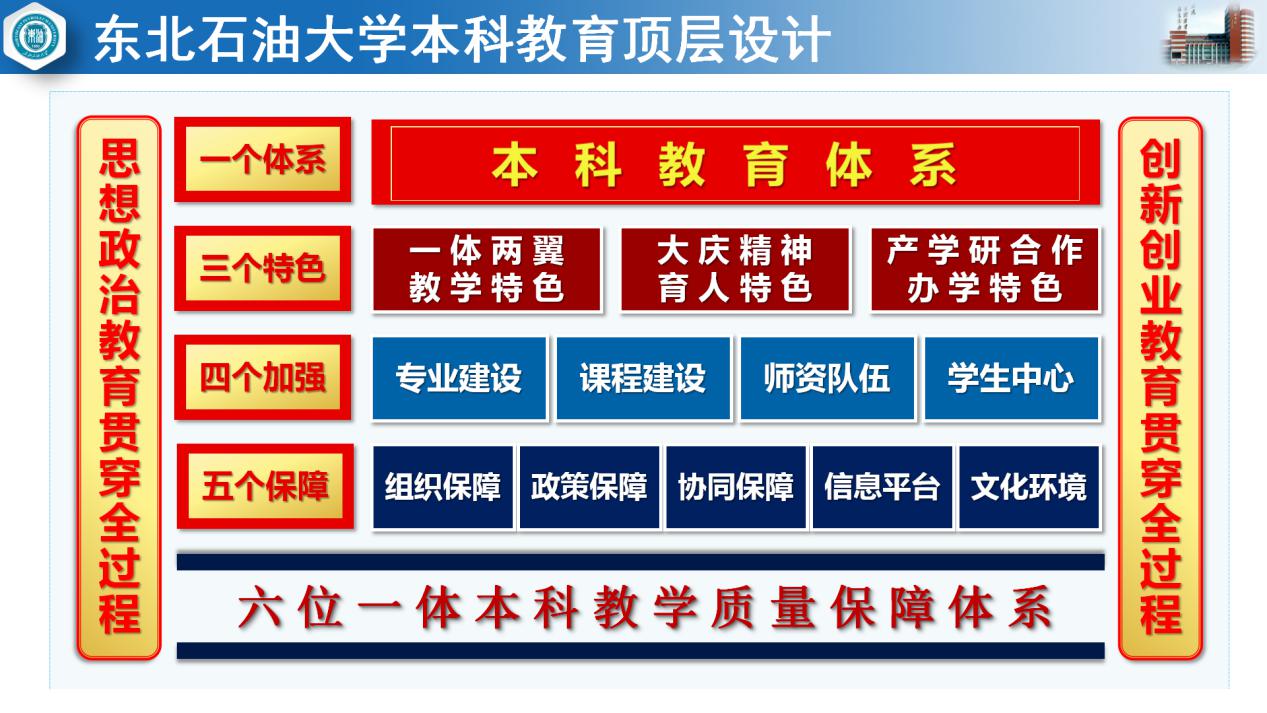 2020年1月,学校召开本科教育大会,发布《东北石油大学本科教育振兴行动计划(2020-2025年)》,提出“一个本科教育体系、二个贯穿全过程、三个特色、四个加强、五个保障、六位一体本科教学质量保障体系”的本科教育顶层设计,制定十大行动计划,全力构建“一体两翼强基础、创新创业提能力、大庆精神育品格、五育并举塑新人”的本科教育体系,争创东油特色的一流本科教育,开启了质量东油的新篇章。