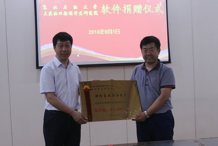 (通讯员 王维红 记者 许丽娜) 8月1日,我校与大庆油田有限责任公司勘探开发研究院向我校捐赠了地震岩石物理分析应用系统(RPS)软件,并在学校地球科学学院514会议室举行捐赠仪式。大庆油田勘探开发研究院副院长陈树民、金阳普泰公司大庆地区经理高超、我校副校长付晓飞参加捐赠仪式。