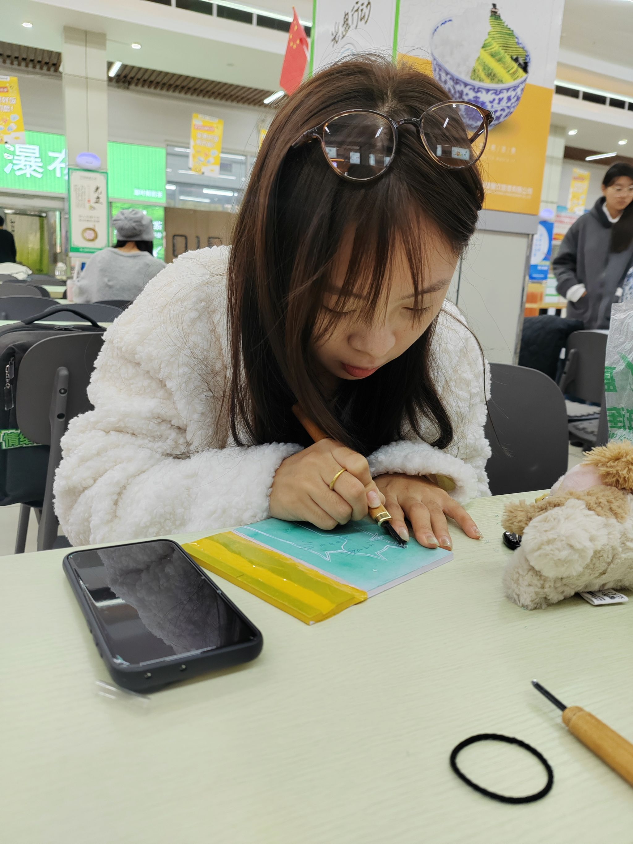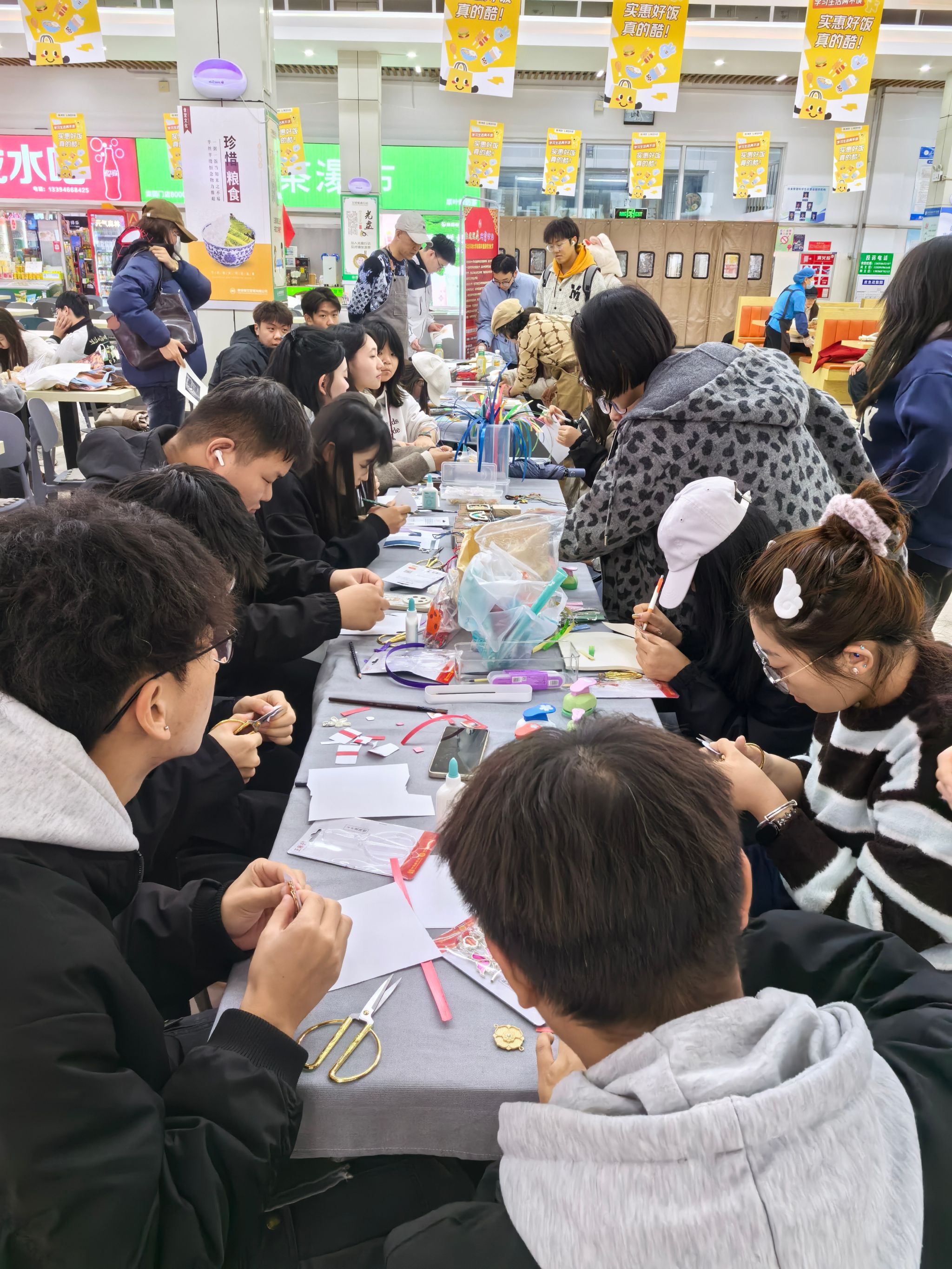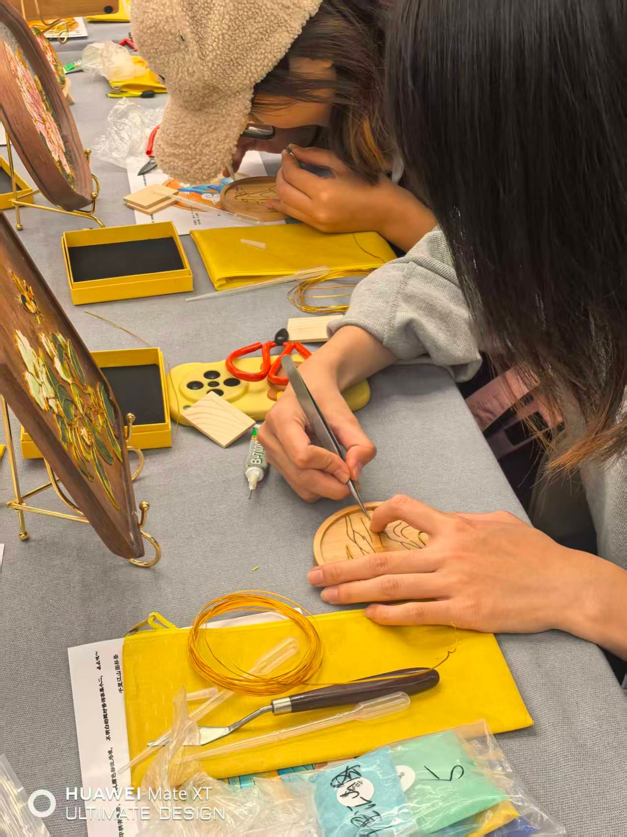 “以手践行,以心悟道”,非遗互动体验活动在三天内走进第一教学楼、教学主楼、音乐厅、二食堂、三食堂等,精选剪纸、版画、芦苇画、景泰蓝掐丝珐琅及拓片五项代表性技艺,邀请师生亲手参与创作。师生们在非遗传承人的指导下,拿起剪刀、画笔,专注地勾勒线条、裁剪图案,大家在亲手创作中零距离触摸中华民族共有的工艺瑰宝,领悟传统造物智慧与中国文化精神。