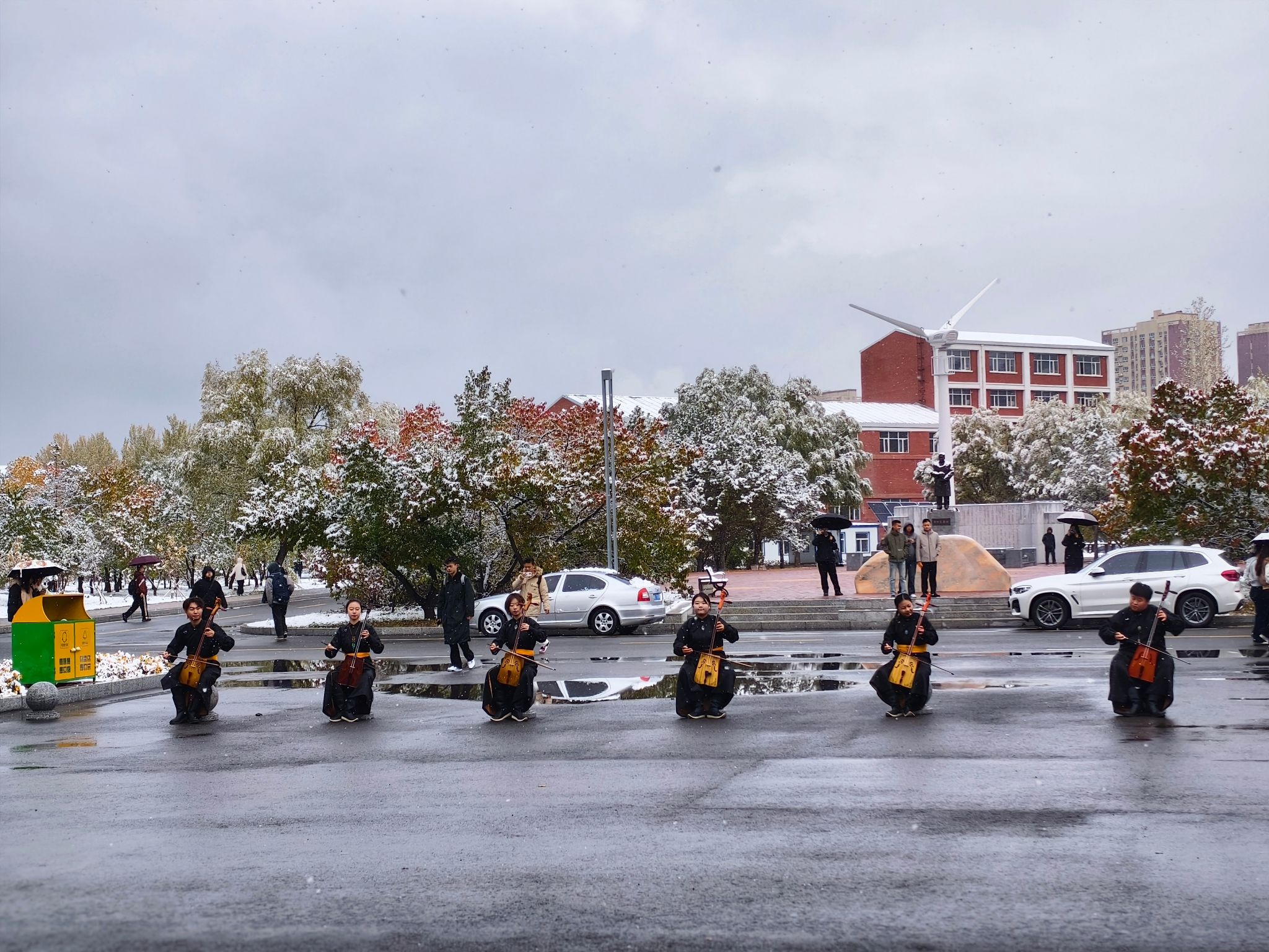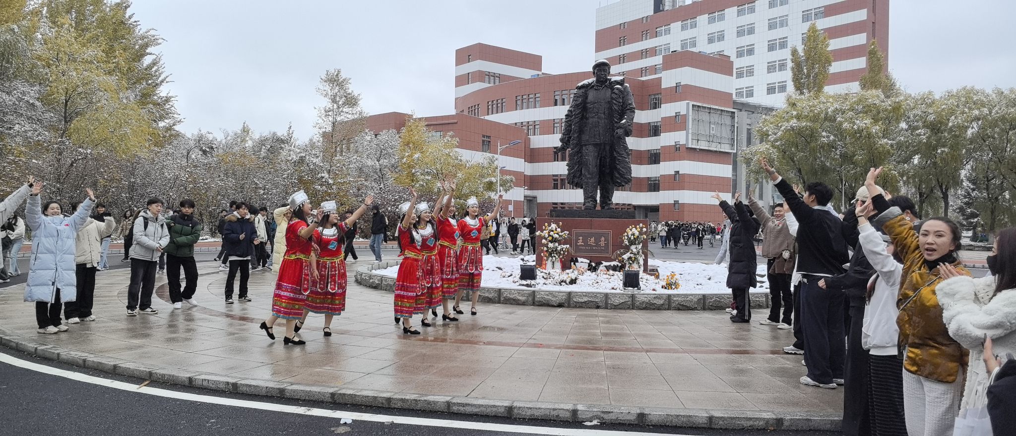 10月15日上午,教学主楼外,一场突如其来的快闪表演伴随着初雪惊艳亮相,演员们身着传统服饰,将呼麦、竹笛与民间舞以灵动鲜活的形式融入校园日常场景。快闪活动也在篮球场、二食堂、铁人王进喜广场等多地点、多时间段呈现,让源自各民族的文化瑰宝在师生身边律动。