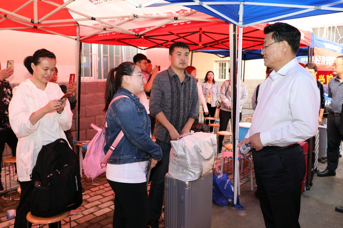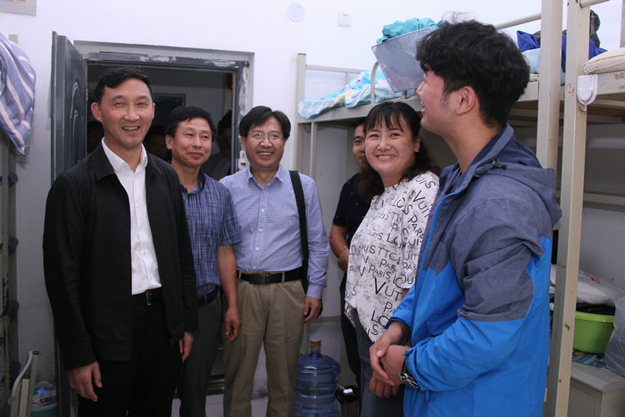 在学生公寓,校党委书记孙明学、校长蒋明虎分别同新生及家长进行亲切交谈,“家是哪的,学的什么专业,对我们的工作还有什么要求?”,并叮嘱迎新工作人员要及时回复、解决新生及家长反映的问题和困难。校领导表示,学校高度重视学生的成长成才,会不断为学生创造良好的学习生活环境。东油的老师认真严谨、干劲十足、爱岗敬业、无私奉献,请家长们放心地把孩子交给东油。他们勉励2019级本科新生,要在未来的求学生涯中,勤学苦读、增长本领、创新思维、提升能力,学有所成并融入到时代发展的浪潮中,争做德智体美劳全面发展的中国特色社会主义事业的合格建设者和可靠接班人。