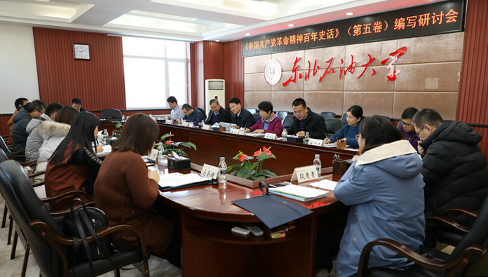 (记者/摄影 许丽娜)为深入学习贯彻习近平总书记关于中国共产党革命精神的系列重要讲话精神,迎接中国共产党成立100周年,加强对革命精神的研究宣传,推进红色文化育人工作,1月16日,《中国共产党革命精神百年史话》(第五卷)编写研讨会在东北石油大学机关4楼会议室召开。我校党委书记孙明学、黑龙江八一农垦大学党委书记董广芝、大庆师范学院党委书记徐克明以及延安大学、石河子大学、黑龙江八一农垦大学、东北石油大学、大庆师范学院5所高校负责编写“抗美援朝精神、兵团精神、北大荒精神、大庆精神、铁人精神”的编写组成员共19人参加会议。会议由《中国共产党革命精神百年史话》(第五卷)主编孙明学主持。