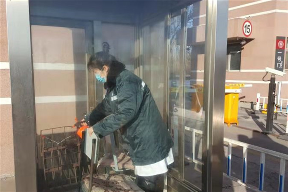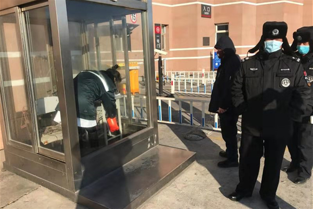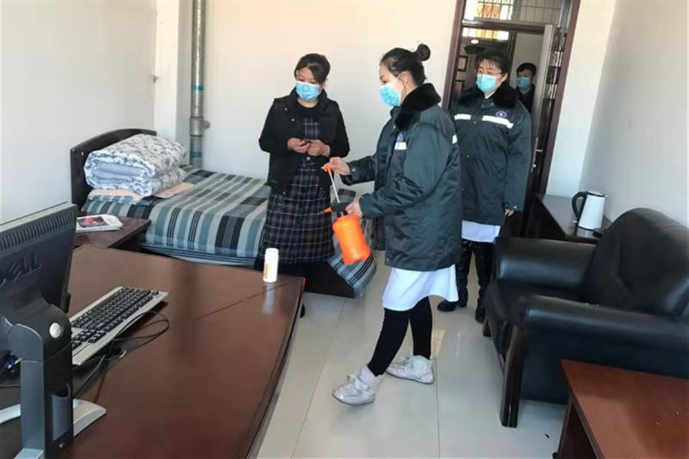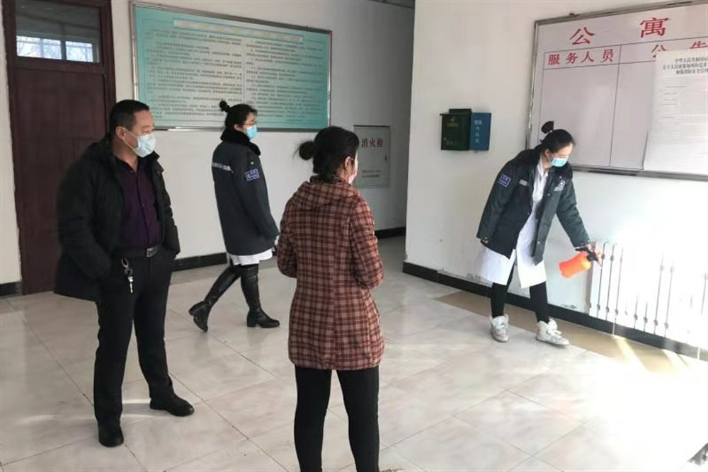 校医院医护人员在厚德13公寓、机关楼总值班室、1号门卫以及国际教育学院进行消毒工作
