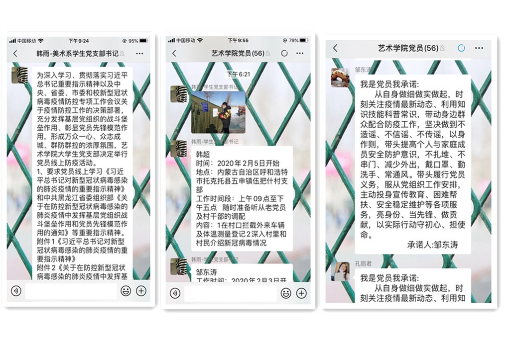 大学生党支部书记王钢组织全体大学生党员通过网络深入学习、贯彻、落实《习近平总书记对新型冠状病毒感染的肺炎疫情的重要指示精神》和中共黑龙江省委组织部《关于在防控新型冠状病毒感染的肺炎疫情中发挥基层党组织战斗堡垒作用和党员先锋模范作用的通知》等重要指示精神,在全体党员中开展“我是党员我承诺,践行承诺事项”线上战“役”活动。