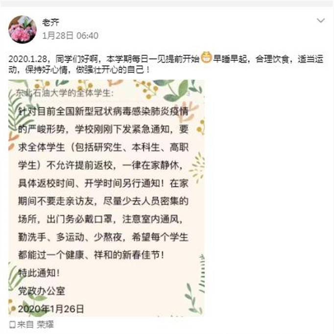 发挥党组织战斗堡垒和党员先锋模范作用。学院党委在防控工作中发挥“不忘初心、牢记使命”主题教育成果,领导各级党组织、党员干部充分发挥先锋模范作用,积极响应“疫情面前,我是党员我先上”的号召。大学生党支部书记齐元俊、王黎黎组织开展了“防疫待在家 安全靠大家”“元宵战役,宅家猜灯谜”等活动,带领党员在网上用图片晒出在家学习、锻炼的场景;通过QQ空间与同学们“每日一见”,及时发布学校通知和防控信息,督促同学们科学防控;大学生党员们倡导“积极配合不添乱”,带头参与活动,有效带动同学们积极防疫,培养积极、健康的心态。学生党员们根据实际情况,积极投身疫情防控工作。研究生张海阔每天定期在吉林省白城市通榆县双岗镇路口和双岗鹿场河西卡点常态化执勤,登记来往车辆,提醒佩戴口罩,禁止外来车辆入内,并参与巡逻检查和运送物资等志愿服务活动;研究生李泽佳在大庆市龙凤区东光街道石油分站社区居委会为社区居民分发酒精,帮助物业工作人员进行出入登记,协助分发防控公告和宣传单,并拉着广播车在社区内做基础宣传工作;研究生党支部书记顾宗琳在甘肃省武威市古浪县直滩乡龙湾村路口执勤,对来往车辆详细登记,协助做好疫情防控宣传;学生李普一协助家人为武汉运送青菜;学生冯康博组建了“抗击肺炎心理支持社工志愿者服务队”,两天时间内共招募到心理咨询师、社会工作师、医务人员、志愿者120余人,完成了市级医院以及让胡路区所有社区的对接工作,累计解决存在心理问题的市民近百人......学院团委大力开展宣传工作,新媒体中心每周推送“战‘疫’,一定赢!我们一起动起来!”、防控卫生知识、典型事迹等内容,持续关注同学们的健康状况和心理状况,做好学校通知发布,全力配合学校做好防控工作。