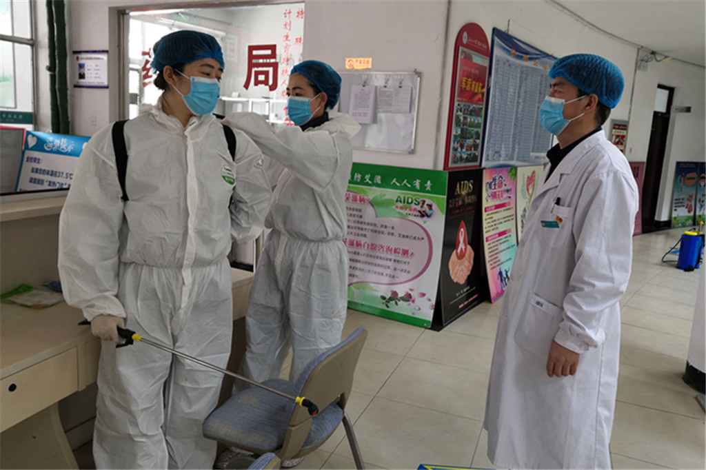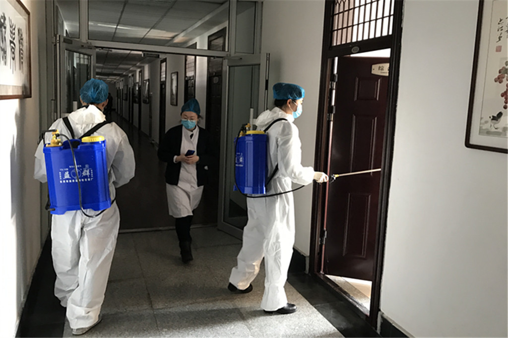 校医院工作人员林淑霞、李秋,院长崔忠太进行消毒工作