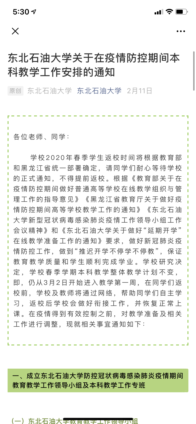 高度重视加强组织领导。疫情发生以来,学校高度重视教学工作,成立了疫情期间教育教学工作领导小组和本科教学专班,下发《东北石油大学关于在疫情防控期间本科教学工作安排的通知》,对在线教学进行全面部署,及时回应师生关切,明确了理论教学、实践教学及教务管理各项工作的具体安排;召开实习实训工作部署视频会议,进一步落实工作责任,加强疫情防控期间学生实习管理工作。