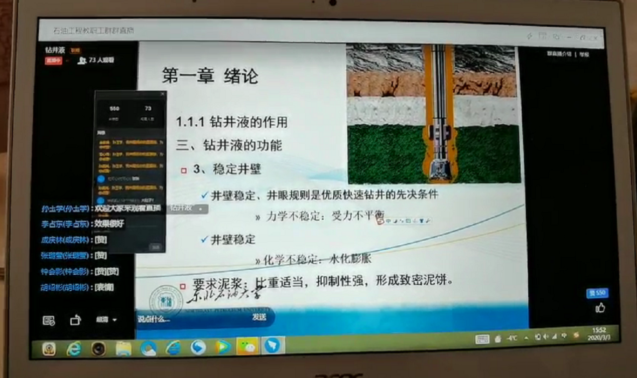 在线教学保障充分有效。积极发挥院系领导、学院督导组及课程组对教师线上授课的监督指导作用,自3月2日线上开学以来,院系领导和院督导专家共听课42人次,做到随时发现问题,随时研究解决方案,保障教学很快进入平稳运行。加强了任课教师、辅导员及班主任对学生线上学习的联合管理与帮扶。任课教师及时将学生的到课情况与课堂表现反馈给辅导员与班主任,三方对有问题的学生进行有针对性地沟通和指导,确保良好的教学效果。开展了课程组、教研室、三级系及学院不同层次、多种形式的教学研讨。院长孙玉学通过钉钉平台给全院青年教师上钻井液工艺原理的观摩课,院党委书记张继红对骨干教师的在线课程进行了专门点评,任课教师们关于线上教学讨论十分热烈,线上教学能力普遍得到快速提高。
