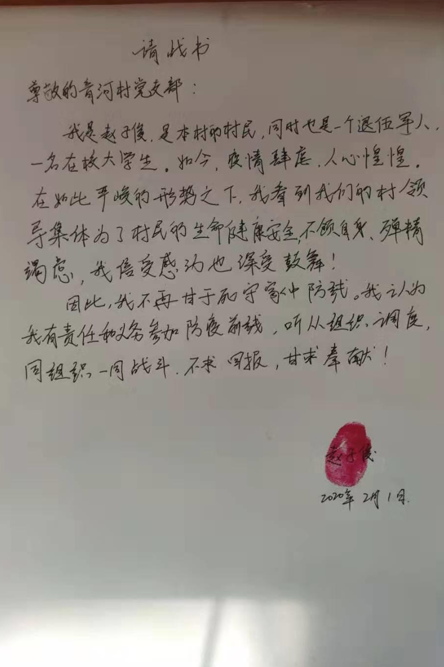 “疫情就是命令,防控就是责任。作为一名大学生,特别是一名退伍军人,我觉得我有责任做些什么。还记得入伍时曾庄严宣誓:誓死保卫祖国。现在,我的祖国病了,我愿意为她付出我的一切!”2月1日,机自19-1班的赵子俊向村支部提交了“请战书”后,便在家乡黑龙江省齐齐哈尔市甘南县音河村路口检查站开始义务执勤。
