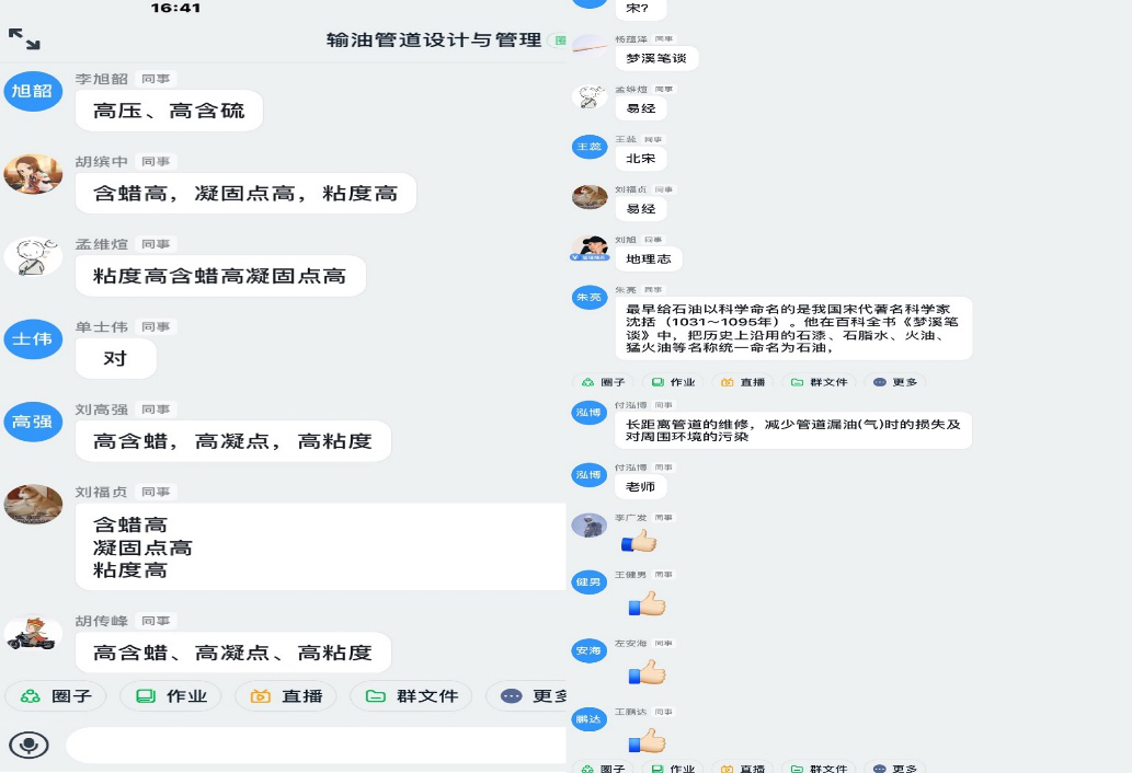 《输油管道设计与管理》是我校课程建设标杆课,疫情发生前已经开始筹备在线课程建设,并陆续开展了部分相关工作,疫情的爆发虽然推迟了在线课程录制时间,但是前期的准备工作为顺利开展网络教学提供了有力保障。考虑到部分学生在家学习可能存在流量不足或网络信号不好的情况,为保证每位同学都能进班、不落课,最终选用了智慧树教学平台语音PPT+钉钉学习圈互动的实时授课方式,确保在低流量下稳定直播课程。为避免网络突发状况影响正常授课,制定了“智慧树课程班群互动”“钉钉在线会议”两套预案,提前与学生完成在线测试。课前测试过程中与素未谋面的学生视频见面,拉近了师生距离。