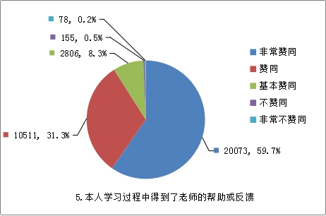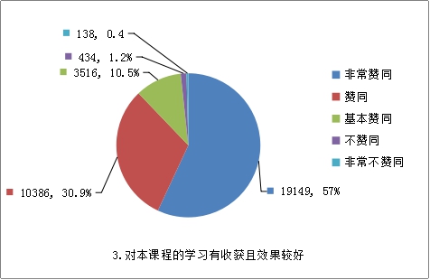 以上两个排名表明,学生对“教师能合理选用教学资源,备课充分授课状态好”“教师对本课程的学习目标和要求阐述的清楚、明确,认真负责,效果好”两项的满意度都较高,说明我们的教师在开课前的准备工作、授课时的状态、认真负责的态度等方面做的都非常好。从其他观测点也可以看出,教师在为学生提供在线答疑和远程协助方面做的较好,但仍需要投入更多的时间和精力;教师应该加强对学生在线学习时的监控、丰富在线学习的形式和内容、加强师生间的在线互动,从而提升在线学习效果;学生也应该提高运用在线课程进行自主学习的能力,提高在线学习的自觉性和主动性。