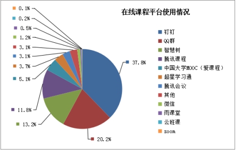 在满意度问卷发出时,要求学生对一周所学的每一门课程进行评价,并不得重复评价。经过对一周的调查结果统计,学生对我校在线课程教学的9个观测点的评价优良率在90%以上,1个观测点的优良率是88%。同时,统计结果显示,教师利用各类平台授课的比率分别为:钉钉37.8%,QQ群20.2%,智慧树13.2%,腾讯课程11.8%,中国MOOC(爱课程)5.1%,腾讯会议3.7%,超星学习通3.1%,云班课、雨课堂等其他平台5.1%。