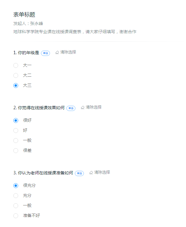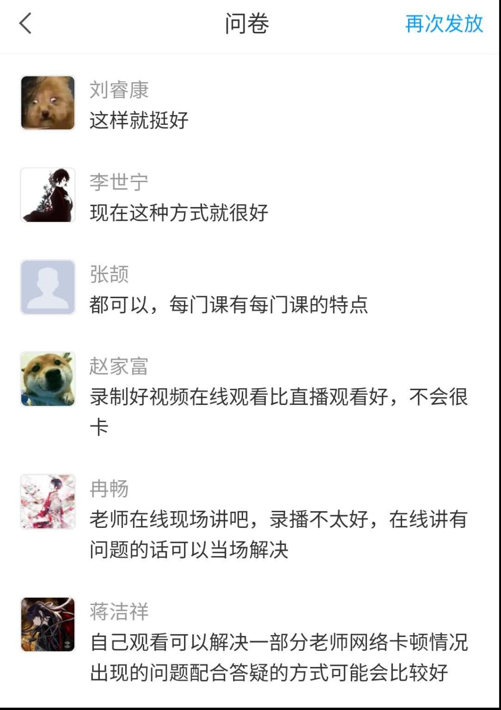 三维跟踪做好持续改进。启动了督导、教师、学生三维跟踪机制,科学科学评价在线教学效果,及时改进教学设计及体系。院系领导与督导依据“1+1”模式建立了8个督导小组,对全部课程进行覆盖跟踪,利用督导QQ群在每晚20:00对当天教学效果进行会商总结。利用问卷之星网站和钉钉智能问卷分别向全院第一周开课的48名教师和752名学生发起在线调查,评估课程教学效果,征集师生建议意见,为持续改进提供依据。三维跟踪显示,全院教师高度重视在线教学,能够充分准备,教学环节设计科学,能够达到课程教学目标,督导、教师和学生对目前教学效果普遍比较满意。