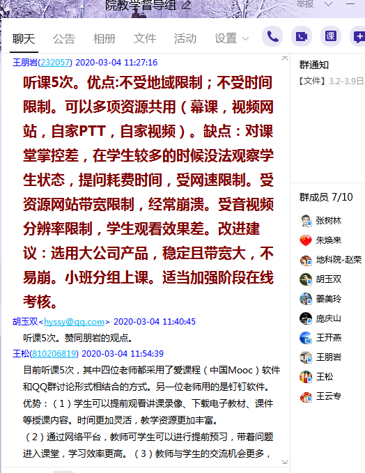 三环并重提高学习实效。3月2日学院正式在线开课,第一周开课的48名教师根据课程特点和课程组教学建议,在设备非常简陋的情况下,发挥聪明才智在家里架起云端讲堂。教师们根据课程特点、平台稳定性、信息呈现效果筛选教学模式和教学平台,精心设计课前、课中、课后三个环节,确保“学、练、思、创”无缝对接,注重学习实效。课前,提前通过教学平台将学习材料、学习重点发送给学生,让学生提前预习,带着问题进课堂;课中,通过腾讯会议、钉钉、QQ群等平台进行直播、在线连麦提问、推送视频,多种形式实施教学任务,监控学生接受程度,及时调整教学策略和方案;课后,教师通过学习通、智慧树和QQ群进行学习效果监测和跟踪,确保线上线下教学实质等效。开学一周来所有课程运行平稳,教学方法推陈出新,教学质量得到有力保证。
