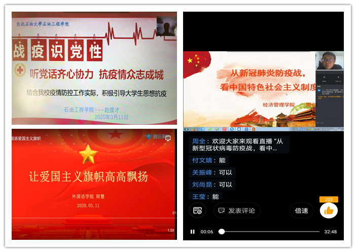 全员备课覆盖全体。全校54名辅导员积极备课,内容包括爱国主义教育、大庆精神教育、感恩教育、法规纪律教育、社会责任感教育、学业指导教育等,覆盖全体学生;通过钉钉、QQ群、微信群等多种形式授课,学工部对全体辅导员微课进行全程观看指导。