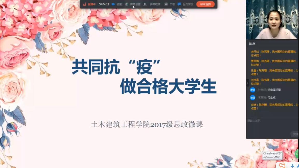 内容形式有的放矢。课堂上,辅导员有针对性地开展思想政治教育:通过解读中国共产党领导和中国特色社会主义制度的显著优势,教育学生听党话、跟党走;通过讲述我国经济社会发展的“硬核”实力等内容,厚植学生的爱国主义情怀;通过讲述“最美逆行者”的感人事迹,引导学生学会感恩、增强奉献精神;通过举办线上党课,加强党员教育;通过云端授课的形式,对学生参加线上学习进行指导;通过就业指导,引导学生明晰就业形势、树立积极的就业观念。