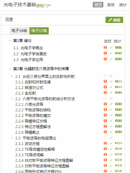 《光电子技术基础》是电子科学与技术专业的专业基础课,开设在大三下学期,本学期授课对象为电子171-2班,共55名同学。多年来,该课程一直坚持开展混合式教学改革的实践探索。为保障线上教学质量,教师采用学习通和钉钉直播平台,有效地利用学习通的资源推送、学习数据统计、督学等功能,并与钉钉直播平台的优势相结合,全面实施混合式在线教学。