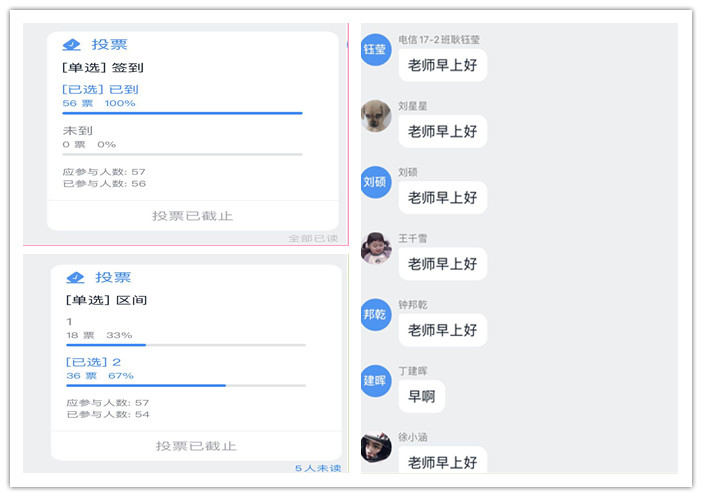 课堂互动提高学习兴趣。网络教学既突破了教师作为教学主体的传统定位,也实现了良好的过程监控。提前五分钟进入课堂签到后,随着同学们的“老师早上好”将师生们带入隔空的“在线课堂”,课上投票式的随机提问让老师实时把握学生对知识的掌握情况,动态口令的实时变化让学生的注意力时刻留在课堂,课内习题的探讨让学生们主动思考积极参与,课堂气氛十分活跃。课下教师通过签到、投票、习题答题情况、课堂听课时长等多角度形成教学过程评价。