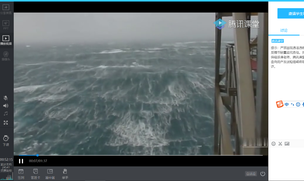 疫情防控期间,“海洋工程环境”课程围绕如何科学设置课程目标、精心提供教学资源、合理评价学生学习效果、有效促进学生学习目标达成对在线教学进行了进一步的改革探索。课程采用“腾讯课堂+蓝墨云班课”教学形式,通过腾讯课堂线上直播进行课堂教学,并在蓝墨云班课中发布教学资源供学生线下自主学习,并采用课堂讨论形式检查课后学习效果。