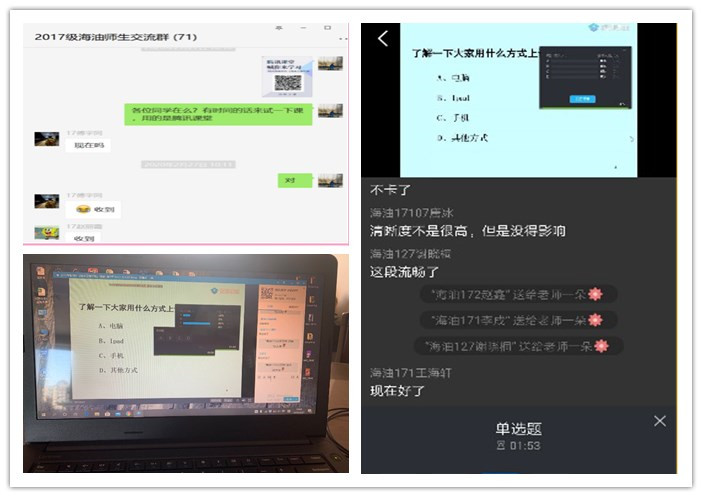 本学期授课对象是 2017级学生,提前联系班级班长建立了微信群,传达学校的安排部署、上课的要求和学习通功能的使用介绍。这种特殊的学习方式,教师和学生都是第一次,需要一定时间适应。为了保证上课质量,提前进行了试课,得到学生关于声音、画面、连麦、流畅性和操作便捷性等方面的反馈。
