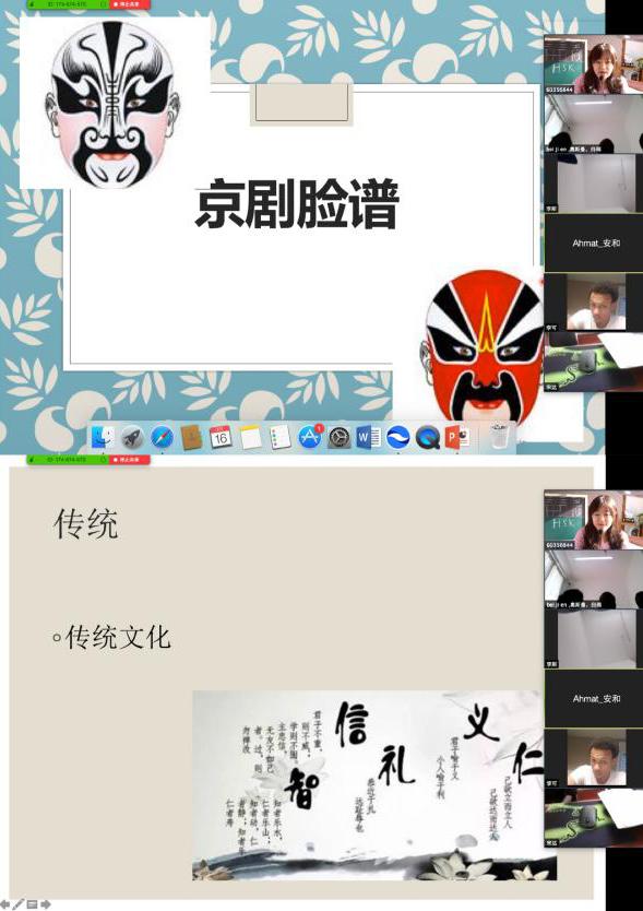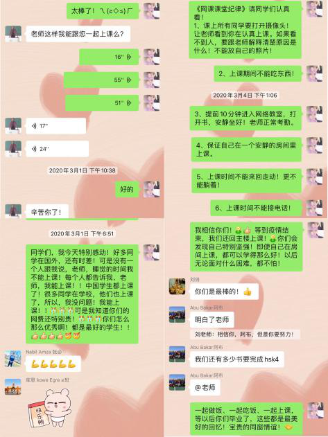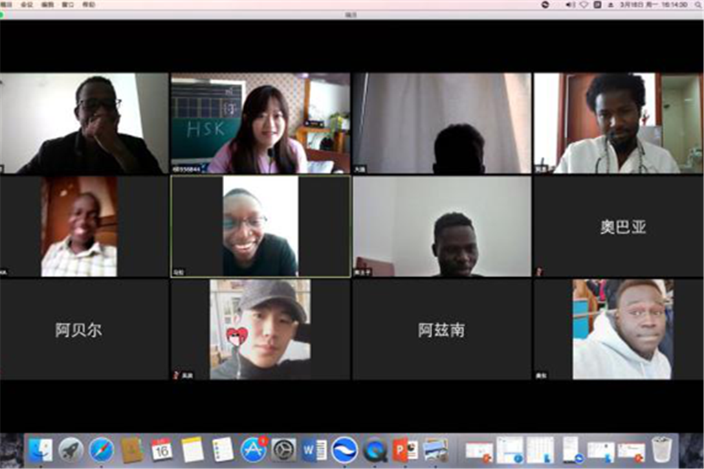 精心策划不分时差同赴“世界之约”。《汉语综合3》是国际教育学院为来华留学的汉语预科生开设的一门核心课程。因2019届公派的12名国际学生团体晚于我校正常教学周6周才入学,意味着3、4学期的课程安排必须早于我校正常教学周,才能保证完成教学任务。疫情发生,在全校尚未开启网课教学工作时,为方便分布世界不同时区的国际学生线上学习,教师在开学前期针对教学平台及软件的选择方面做了大量工作,经过了“了解—辨别—分析—求助—推翻(注册方式、内设情况、费用、卡顿情况、互动性、摄像头分辨率、台上人数......)—选择试用“瞩目”在线教学平台—正式上课—网络环境优化—突发事件应急处理”一系列过程,进行了充分准备。
