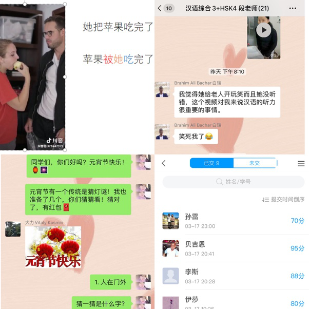 “混合式”教学新模式效果显著。以学生为中心,采用“混合式”教学新模式。为无时差困难的学生进行汉语综合主讲课的在线直播授课;对于存在时差困难的学生,采用课后通过观看教学全过程的视频回放自主学习。直播课堂上通过有趣的抖音短视频资源,结合国际学生自身特色,采用启发式教学,示例、练习以及讨论的话题紧密贴合学生的日常生活,课堂上与学生进行充分互动,学生们积极踊跃回答问题,收到了良好的学习效果。课后按照教师要求完成“荔枝”平台、学习通APP的预习和作业任务,教师通过学情与成绩统计、课上口语交际任务打分、微信“24小时”线上答疑,多维度及时了解学生线下复习掌握程度,形成过程性评价,随后复练课即可有针对性地对“难题”进行讲练。同时,在班级微信群内结合短视频资源举行元宵节“猜灯谜”等丰富的活动,持续提供汉语语境,用轻松活泼的方式完成学习,收到学生欢迎。