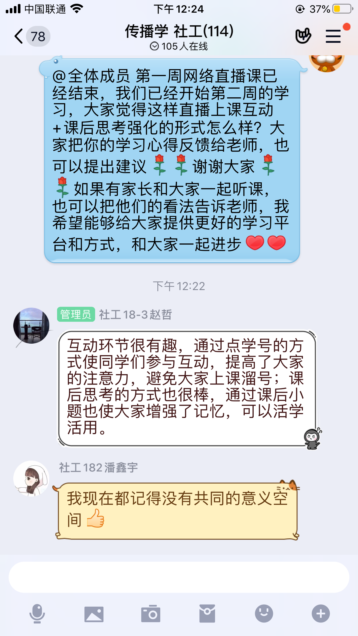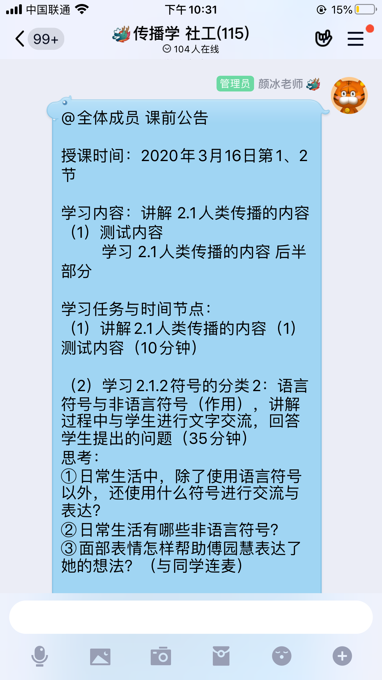 贯穿问题意识,引导学生学中有思。平台问题解决了,如何让学生在学习中真正有所思有所获,而非机械地完成听课打卡的任务,是颜冰思考的又一个问题。在线直播教学时师生虽同时在线,但空间并不同在,如果按照一般归纳或演绎思路进行理论课教学,学生容易出现疲乏、倦怠现象。为了避免这一情况,颜冰选择重新梳理整个传播学教学内容,通过运用一个个问题簇将知识点贯穿起来,通过问题激发学生的学习和探索兴趣,通过问题的解答使学生掌握专业知识,再通过引导学生文字交流或连麦回答开放式问题,提升学生的知识迁移和运用能力。例如,在“人类传播的内容——非语言符号的作用和分类”教学中,就设计了引入性问题——“日常生活中,除了使用语言符号以外,还使用什么符号进行交流与表达?”“有哪些艺术形式是通过身体语言来传递信息的?”、归纳性问题——“面部表情怎样帮助傅园慧表达了她的想法?”、应用性问题——“航母工作人员为什么穿不同颜色的马甲?”“请思考听觉性非语言符号在现实生活中有什么应用?”、拓展性问题——“2020年1月27日晚8时武汉居民开窗高唱‘国歌’‘我和我的祖国’,运用这些听觉性非语言符号传递了什么情感”等逐层递进的问题,使教学活动从原来的学生“无问题”、教师“一言堂”转变为学生自主提问,互相解答的“问题导向”空间。