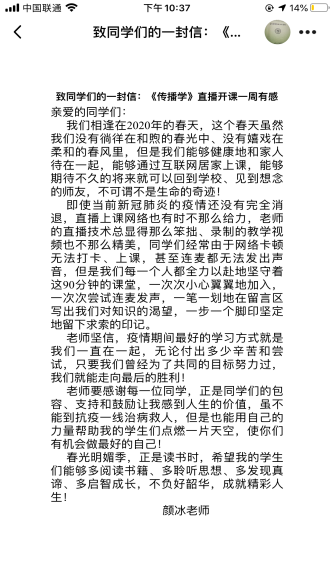 回归学生本位,精选授课平台。疫情发生后,如何从原来专注于线下课堂教学,转为依托互联网开展好教学,是教师必须深入思考的迫切问题。《传播学》课程主讲、全国优秀教师颜冰教授认为,在线直播教学与传统教学相比,突破了传统课堂时空的局限性,大规模、远距离、多次回放教学内容,极大便利了疫情期间居家学习的同学们;同时,由于师生缺失眼神交流、语言互动,学习状态缺乏监督等瑕疵,使教学过程管理及效果受到影响。通过对在线教学近三周的思考与实践,她发现,如果准确把握住在线教学的精髓,就可以适度规避这一局限。在线直播教学虽然缺失了传统课堂上面对面交流的直接性与便捷性,却使课堂教学从原来一名教师同时面对多名学生、获得学生学习效果反馈的“点对面”交流方式,转变为教师依托互联网媒介在原来“点对面”基础上,叠加随时关注到每名学生学习效果的“点对点”交流方式。传统课堂由于时间和交流媒介的局限,教师不可能准确识别每名学生的困惑,也不能随时回答学生遇到的问题,课堂上学生往往不得不变成教师的“聆听者”,而非与教师同步的“思考者”。在线直播教学过程中,教师与学生的交流渠道除了语言以外,还增加了文字,换言之,每一名学生可以在听老师讲课同时,将自己的困惑随时以文字方式记录在留言区,这就构成了教师与学生沟通的“双通道”:教师通过语言媒介实现对全体学生知识的传播,通过文字媒介帮助个别学生答疑解惑,从而将学生的听课过程重塑为“聆听——思考——提问——解答——巩固”的崭新学习链条,学生可以在被动接收知识的同时,最大限度地追随老师的思路,回归到提升学生学习能力和专业素养这一人才培养主线上来。
