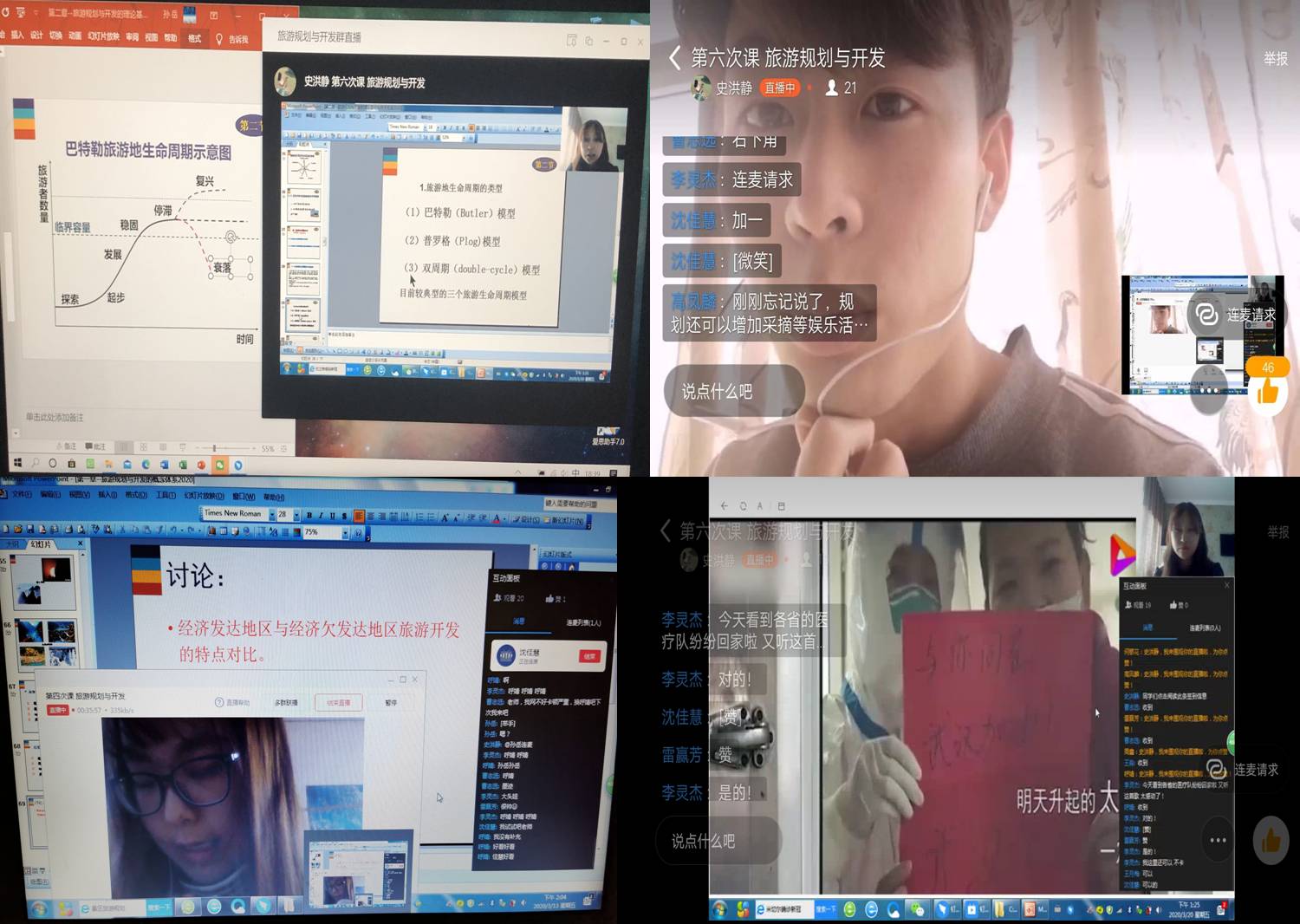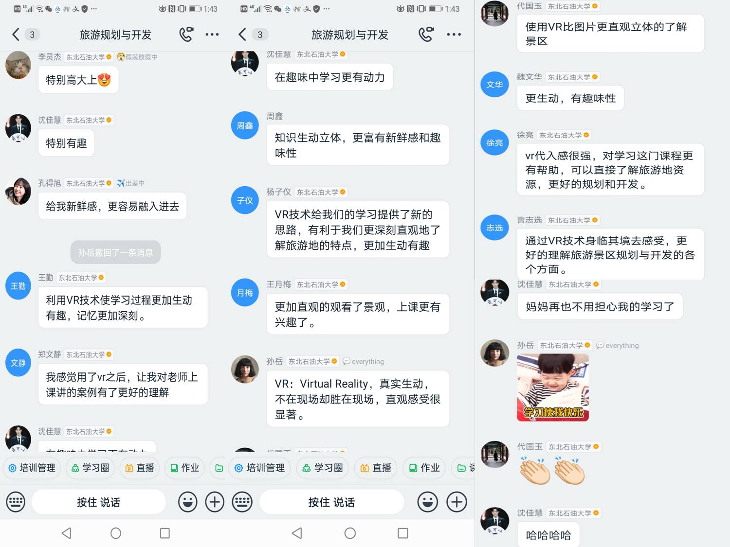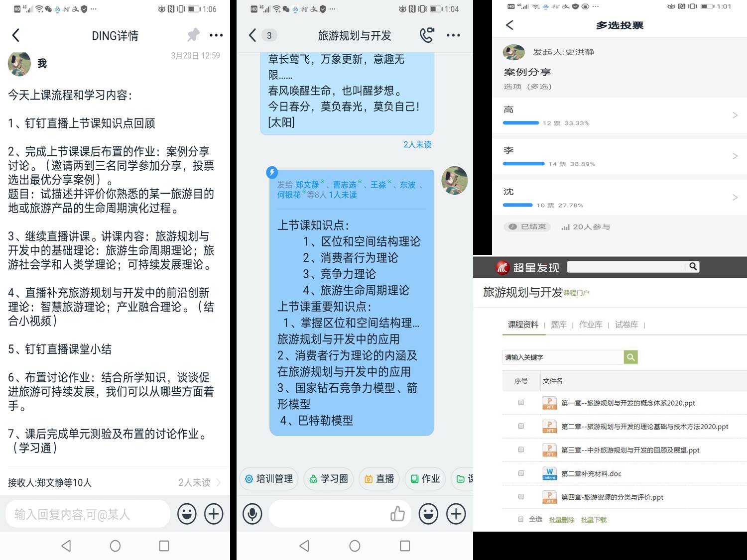 坚持合理设计内容,优化网络教学流程。建立以VR系统为核心,钉钉、学习通、微信班级群为载体的网络教学模式。课前通过钉钉和微信发布学习资料、主要知识点及上课流程。播放抗疫歌曲、视频提升民族凝聚力和自豪感,引思政入课堂。课中采取钉钉平台直播讲授,辅以“超星学习通”优质课程资源。利用钉钉平台屏幕共享功能,投放虚拟现实场景,同时连麦开展旅游规划与开发案例研讨,并实时关注消息面板,开展全员互动交流。课后利用钉钉直播大数据进行课堂教学质量分析,积极开展师生教、学互评,改进教学质量,督促学生学习。保存直播视频,方便学生回看和教师答疑。及时在学习通平台发布研讨作业和章节测验,清晰记录学生平时成绩积分。