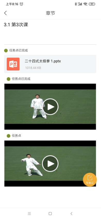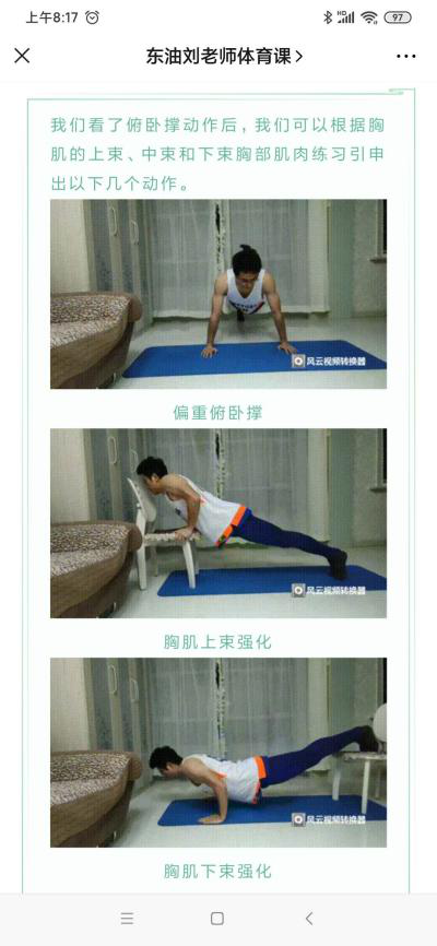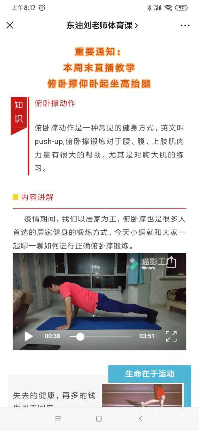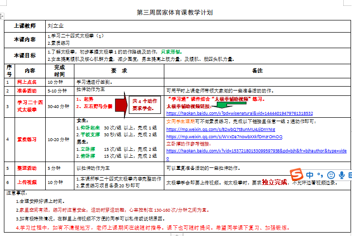 线上教学资源。本学期体育课教学任务主要包括简式 24 式太极拳学习和身体素质练习(以高抬腿、仰卧起坐和俯卧撑三个动作为主)。截至目前,24 式太极拳教学视频已投放在学习通供学生线上学习。由于学生的学习能力不同,教学视频无法满足全体学生学习的需求。为丰富课程资源,刘老师建立公众号,将包括太极拳动作补充讲解、示范,身体素质练习的动作示范和讲解推送给学生,作为拓展练习资源,随时随地满足学生学习需求。
