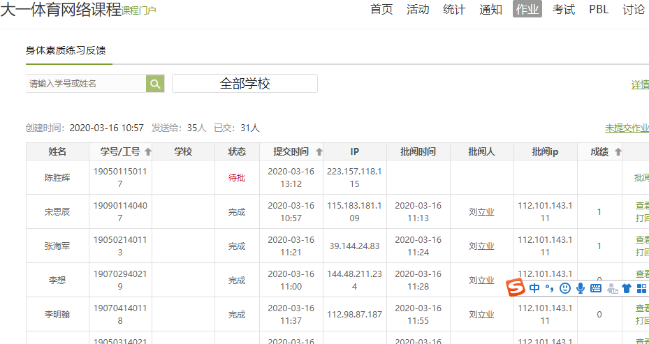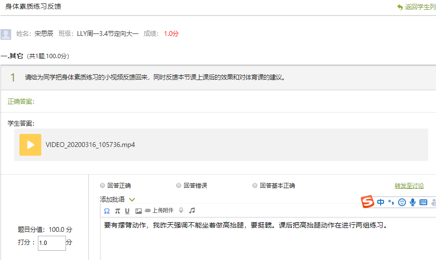 课后练习。教师对学生太极拳视频和身体素质锻炼视频进行批阅,反馈存在的问题,指导学生改正。