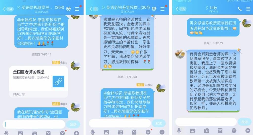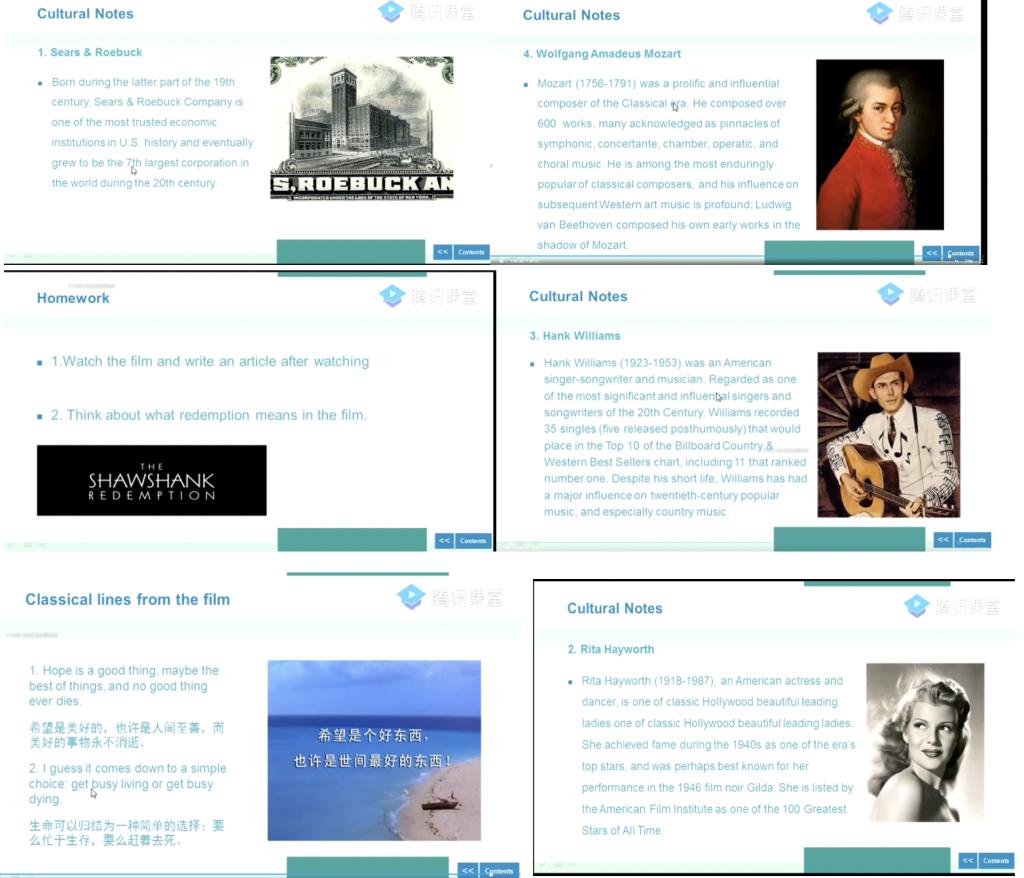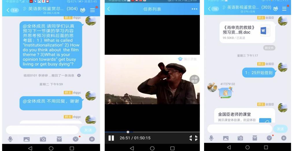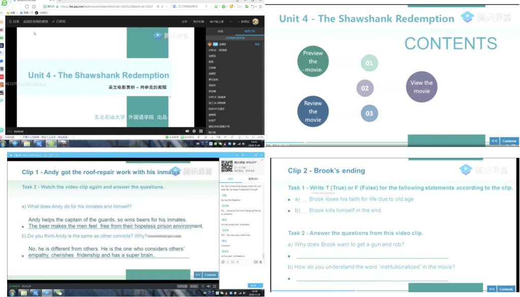 为了更生动形象地展示这门课的思想和精髓,达到更好的教学目的,帮助学生通过欣赏英文电影了解西方的历史和文化,提高学生的综合英语能力,外国语学院的老师们认真研读教材,在吃透教材的基础上根据每个单元的电影类别精心地制作了适用于翻转课堂的学习课件,并选定腾讯课堂为《英文影视鉴赏》在线授课平台,选定QQ和微信群为辅导答疑平台。