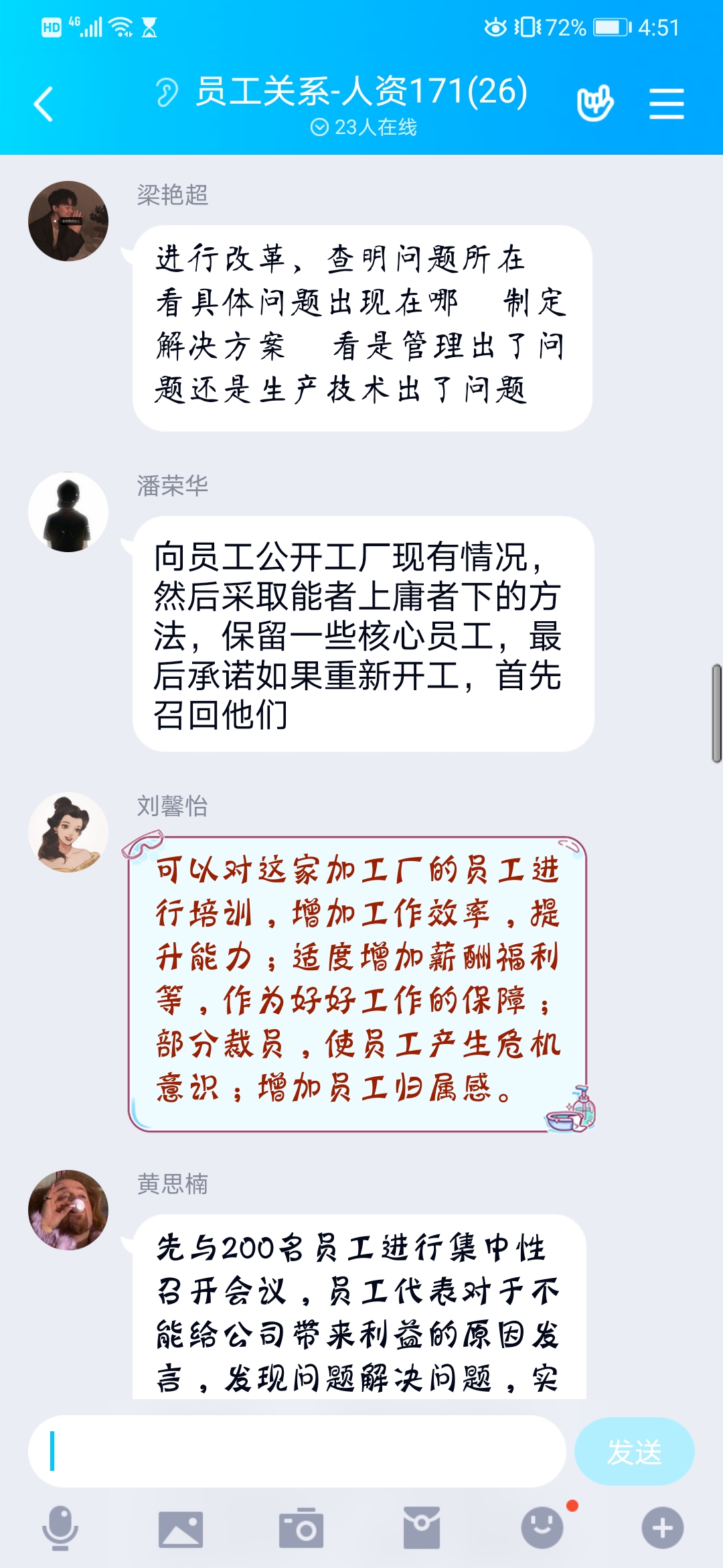 一门网络直播课程顺利地进行,不仅需要教师做好充分准备,同时还需要学生课上的积极配合。陈虹池讲授的这门课程采用小班授课的形式,这种方式可以保证所有同学都能够有机会参与到课堂的互动和和抢答环节。经过3周的教学,师生在课前互动中建立了更好的师生关系,学生基本8分钟内就能全部进入直播间,出勤率一直100%。课堂上,学生们积极讨论、配合教学;课下也能很好的预习新课理论、案例及辅助课程。同时,学生们有问题会在群里讨论,陈虹池则在线答疑。