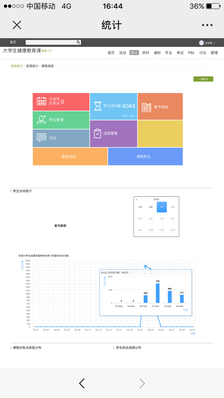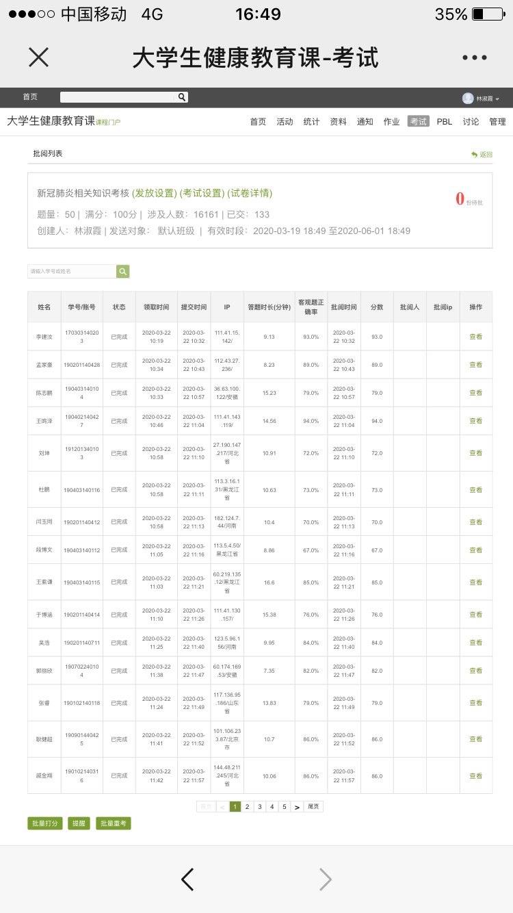 课程由“教学”、“通知”、“资料”、“作业”、“考试”、“PBL”、“讨论”、“统计”、“管理”等模块组成。教学内容除了常规的大学生健康教育课程外,主要是预防控制新冠肺炎等传染病的知识,包括《如何预防新冠肺炎》、《面对新冠肺炎我们应该怎么做》、《新型冠状病毒肺炎流行病学知识110问》、《七步洗手法》等。同学们通过线上理论学习、视频学习,并随机抽取试题库试题参加考试答题。
