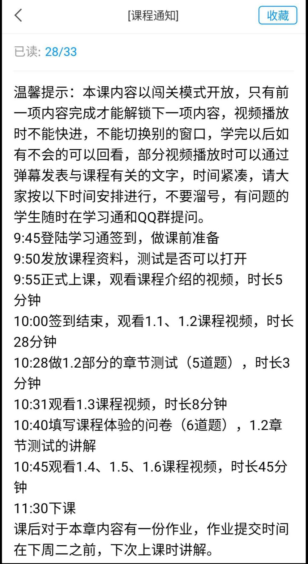 课中“任务驱动”,完成交互学习。衣老师的课程以闯关模式发布任务点,只有上一个任务点完成才能看到下一个任务点,让学生按照教师讲课的顺序学习。在个别小节后面进行了章节测试。因为各任务点结束后需要学生自行打开下一个任务点,因此学生必须认真学习才能及时开始任务,教师在学习通后台实时监测学生观看进度,并在QQ群中点名督促学生学习。