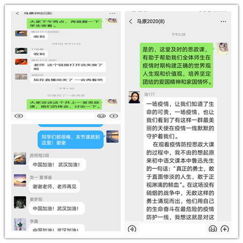 在思政课教师引导下,学生们踊跃发言:“引用思政大课中的一句话‘多难兴邦’,危机本来就存在着‘危险’与‘机遇’,毫无疑问,中国是在这次考验中做得最好的,是交了满分答卷的”,“只有对大自然充满感恩与敬畏,并去付诸实践,那么大自然也一定会重新回复我们的的善意”,“在这场战役中,有许许多多的人值得我们尊敬,值得我们敬仰。生在‘种花家’,我们大学生更应该抓住一切机会去回报国家,建设国家。我,爱中国”。学生们感受到了中华儿女相亲相爱大团结的“温度”、中国工业众志成城的“速度”以及我国在国际社会体现的“气度”,坚信战“疫”必胜。课堂讨论后,学生们在课下仍持续不断向教师们发送感受和思考。