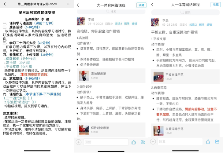 线上教学中,体育教研部为保证学生在家上好体育课,以学习通为主要线上平台开展了体育理论课程与太极拳课程。同时以开学后的素质测试激励同学们进行锻炼。在课程内容充实的情况下,李晨老师通过打造“云操场”丰富课堂形式,激发学生的学习兴趣,真正意义上达到体育课堂“不断线”。