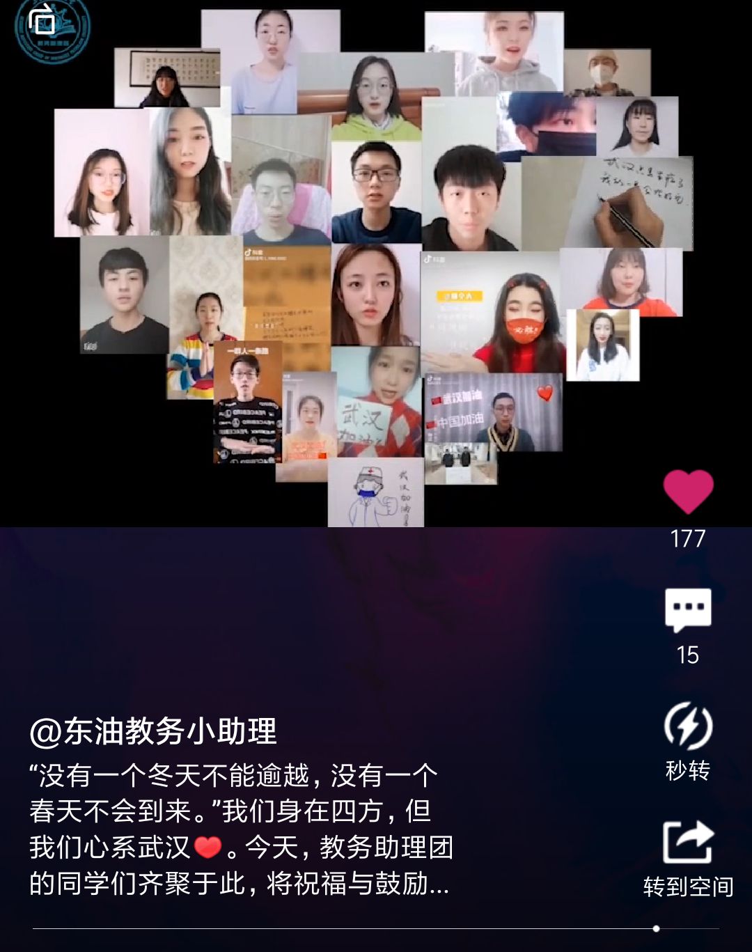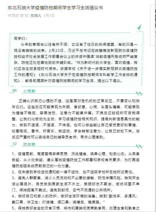 开学前夕,制作和发布《东北石油大学疫情防控期间学生学习生活倡议书》,号召同学们合理安排作息时间,做到学习质量不降低,鼓励同学们读书、学习,向战“疫”英雄学习,用知识和能力战胜危险,用勇敢和担当化解灾难。