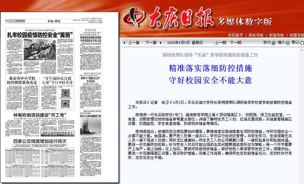 【大庆日报】蒋明虎带队指导“东油”复学前疫情防控准备工作