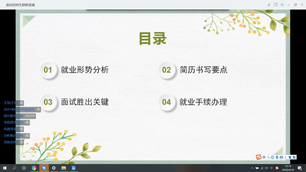 经济管理学院党委书记邵强首先介绍了2020年的就业形势,他指出,受新冠肺炎疫情的影响,今年的就业形式非常不乐观,希望毕业生合理制定就业目标,结合当前环境采取最优策略,为自己交出满意的答卷。经济管理学院院长赵俊平希望所有毕业生克服困难,认真完成毕业设计环节,正确面对疫情下的就业压力,积极寻找就业机会,有困难及时联系老师,经济管理学院是所有学生的坚强后盾。经济管理学院党委副书记周全介绍了目前学生的就业情况,他表示,经管类各专业受疫情影响很大,招聘企业和岗位数量都比以往明显减少,希望毕业生能理性看待就业问题。碧桂园服务集团东北区域人力资源负责人、我校经管院优秀校友靳涛作为企业代表,从碧桂园服务集团的企业规模,工作方式和地点,薪资待遇等方面为毕业生做了全面的企业宣讲,欢迎毕业生去碧桂园实习、工作。辅导员曲径通过分析往年就业数据,希望毕业生能够调整心态合理定位,理性面对考研和公务员考试,注意凝练自身优势,提高就业能力,同时她还会继续为学生提供就业信息和咨询帮助。为帮助毕业生提升就业竞争力,校就业指导中心教师李婉婷从简历制作、面试技巧、就业政策及手续办理等几方面做了讲座。