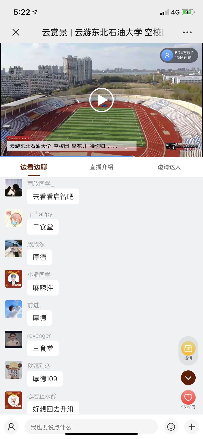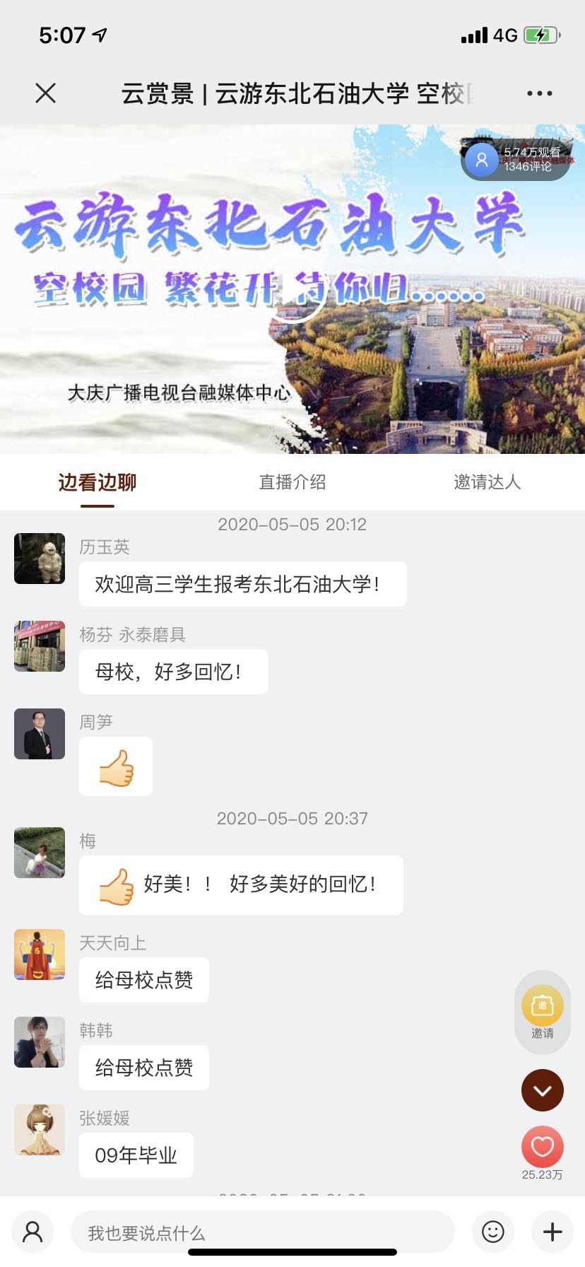 “学校的花儿太好看了!”“在线想念学校!”“毕业45年了,为母校的辉煌发展再次点赞!”“毕业快10年了,当年在图书馆学习时真的很幸福。”“我好想念学校的美食......”精彩的直播让师生们、校友们、网友们热情高涨、感慨万千,大家纷纷留言点赞,尽情抒发对学校的思念和祝福。截止目前,直播观看量达5.73万人,点赞量达25.23万。