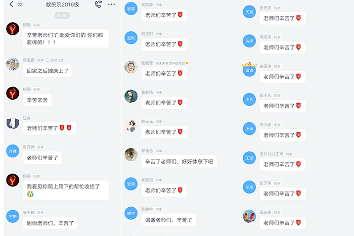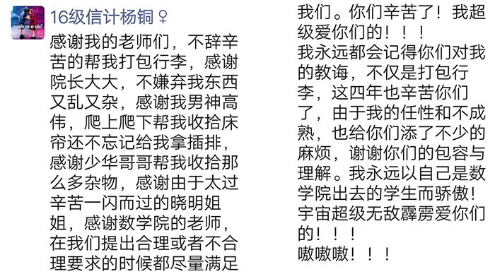 一件件细心查找,一包包精心整理,一声声关切询问,一次次往返搬运,老师们把对毕业生的思念与祝福融在行动中,装进包裹里,用爱为学生书写下东油时光的温暖记忆。电子科学学院刘挺老师为同学们写下这样一段文字:“今年毕业季的校园,没有平日里的热闹和喧嚣,也没有即将分别的惆怅,没有毕业演出的音乐,也没有师生同框的毕业照,所幸宿舍里还有你们的东西,还有你们在这个学校的全部印记,而我要将这些印记尽我全力打包邮寄给你们。今天我转战七个宿舍,亲手参与打包了一百多件行李,希望你们永远记得,曾经有那么一所学校,在疫情尚未离开的时候,有那么一群老师,顶着炎炎烈日,将你们在东油的所有美好印记,一一整理,一一打包,尽全力寄给你们,希望你们未来人生的道路上,不管飞得多高多远,或者是多忙多累,想起母校的时候,心里面能泛起一点暖意。”目睹了老师们的辛勤工作,视频另一端的同学们非常感动。“老师们辛苦了”“谢谢各位老师”......一句句温暖的话语跨越云端,回荡在师生之间。