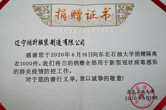 辽宁鸿升服装制造有限公司在积极组织恢复生产的同时,勇担社会责任,结合防控疫情需求,发挥企业优势,积极筹措资金,购置生产材料,组织员工紧急生产隔离衣,并通过快递邮寄的方式为我校捐赠隔离衣1000件,对此我校表示诚挚的感谢和敬意。据悉,辽宁鸿升服装制造有限公司于2016年成立,经营范围包括机织服装、针织服装、服饰、床上用品等。