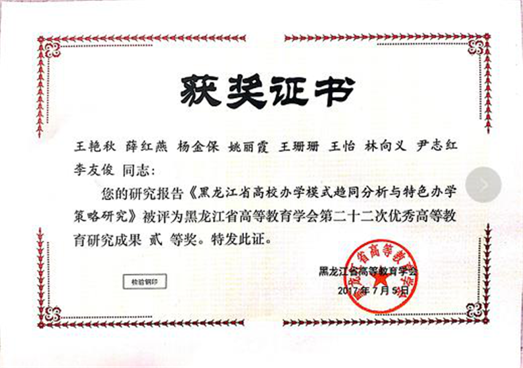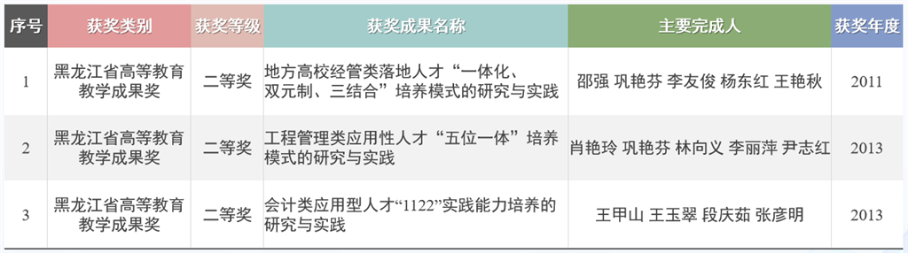 荣获中国石油企业协会优秀科研成果奖、黑龙江省社会科学优秀科研成果奖、黑龙江省优秀教学成果奖、黑龙江省高校人文社会科学优秀成果奖36项。