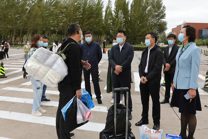 校领导孙明学、蒋明虎、郝丽红、于长青来到学校1号门及各学院报到点,看望返校归来的学生,并与学生和家长亲切交流,关切地询问学生返校路途情况,并请家长放心,学校一定会为学生的学习、生活做好充分保障。在各学院报到点,校领导向忙碌在一线的工作人员和志愿者表示感谢,叮嘱大家做好自身安全防护。