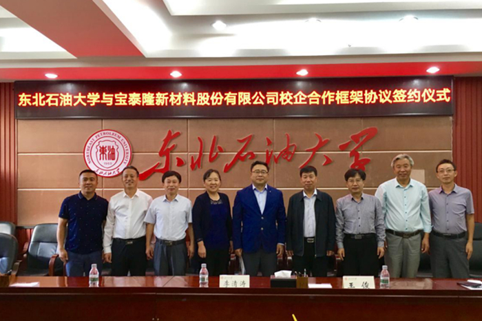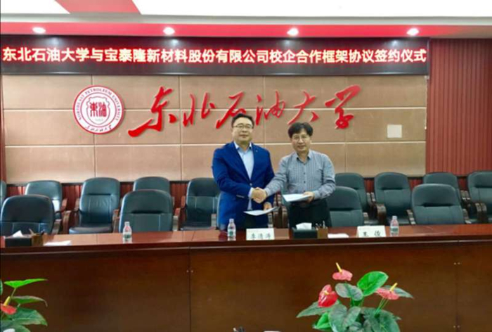 仪式上,化学化工学院院长王俊、李清涛分别代表东北石油大学化学化工学院和宝泰隆新材料股份有限公司在校企合作协议书上签字。