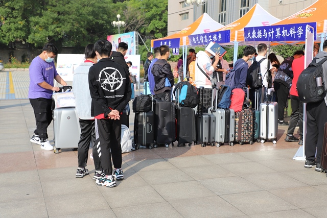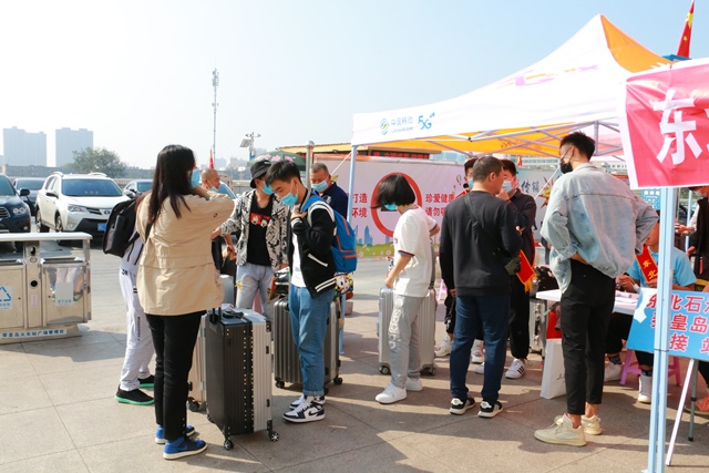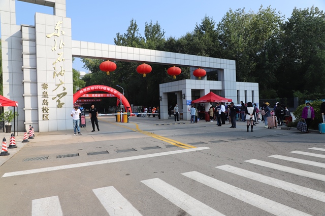 清晨7点,校区迎新工作人员在秦皇岛站准备就绪,等待新生的到来。新生在校区南门,经查验录取通知书、提交核酸检测证明、体温检测后进入校园,在志愿者的引导下,完成报到程序。