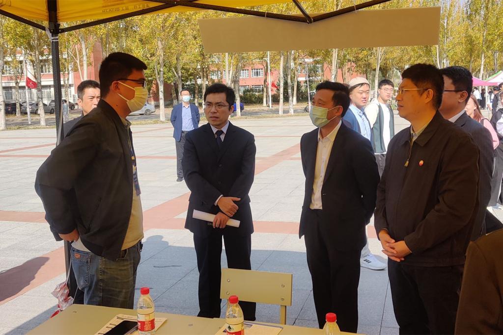 学校党委高度重视中石油进校宣讲招聘工作,校长蒋明虎深入双选会现场看望慰问用人单位代表,了解中石油的用人需求,听取用人单位建议,并对中石油长期大力支持我校就业工作表示感谢。在咨询会现场,蒋明虎与应聘学生沟通交流,鼓励学生发扬大庆精神、铁人精神,敢于担当时代责任,踊跃报名中国石油,扎根油田,为祖国的能源事业贡献力量。