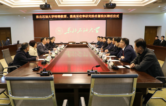 程杰成在致辞中指出,东北石油大学是国内最早从事提高采收率研究的高校,在提高采收率领域取得的一系列高水平科技成果为油田的持续高产稳产作出了突出贡献。提高采收率研究院的成立,体现了学校为更好地服务油田、拉动地方经济发展,进一步整合优势科研力量,突出特色研究方向,为校企深度合作和科技成果转化搭建平台的责任与担当。他表示,对受聘为提高采收率研究院名誉院长并成为一名东油人深感荣幸,感恩学校老一代教授的关心指导,历任领导和现任领导的信任和支持。大幅度提高水驱后采收率是石油工业亟需解决的重大难题,更是保障我国油气供应安全的重大战略需求,愿和学校一道大力推进提高采收率理论技术的发展,加强校企科研资源的有效联合,建立一支强大的提高采收率攻关团队,并充分发挥提高采收率研究院在校企合作中的桥梁与纽带作用,为国家能源供应安全作出新贡献。